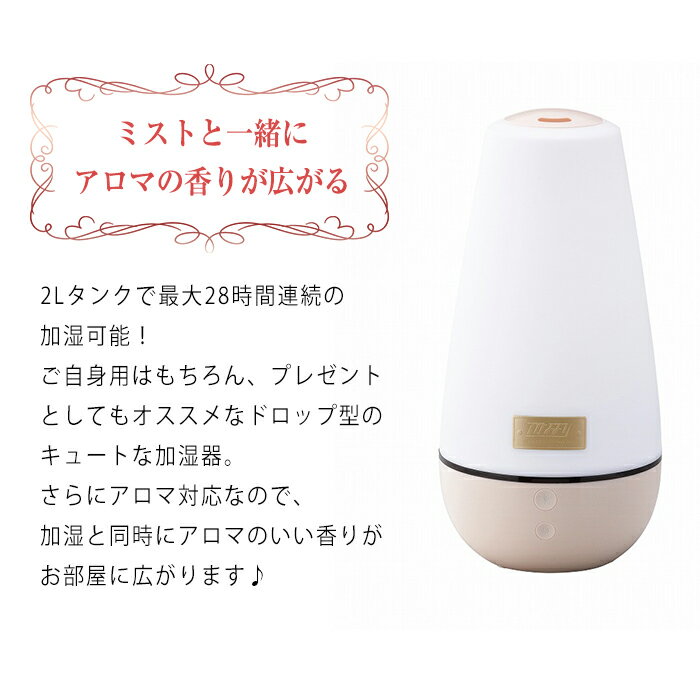 商品名 Toffy ダイレクトドロップアロマ加湿器 2L 特徴 2Lの水タンクで最大28時間連続加湿可能! 別売りのアロマオイル等を入れれば、加湿と同時にアロマも楽しめる加湿器。